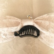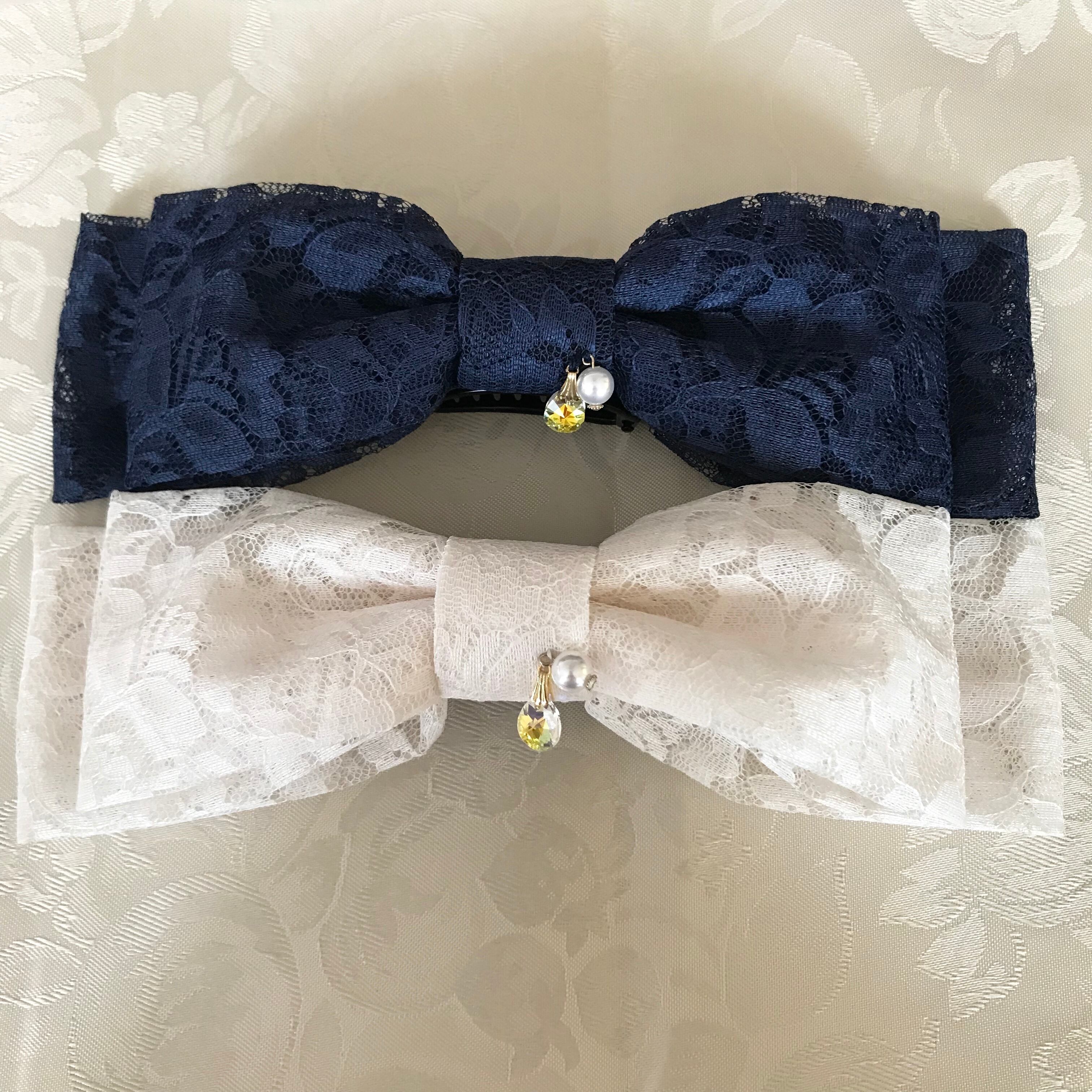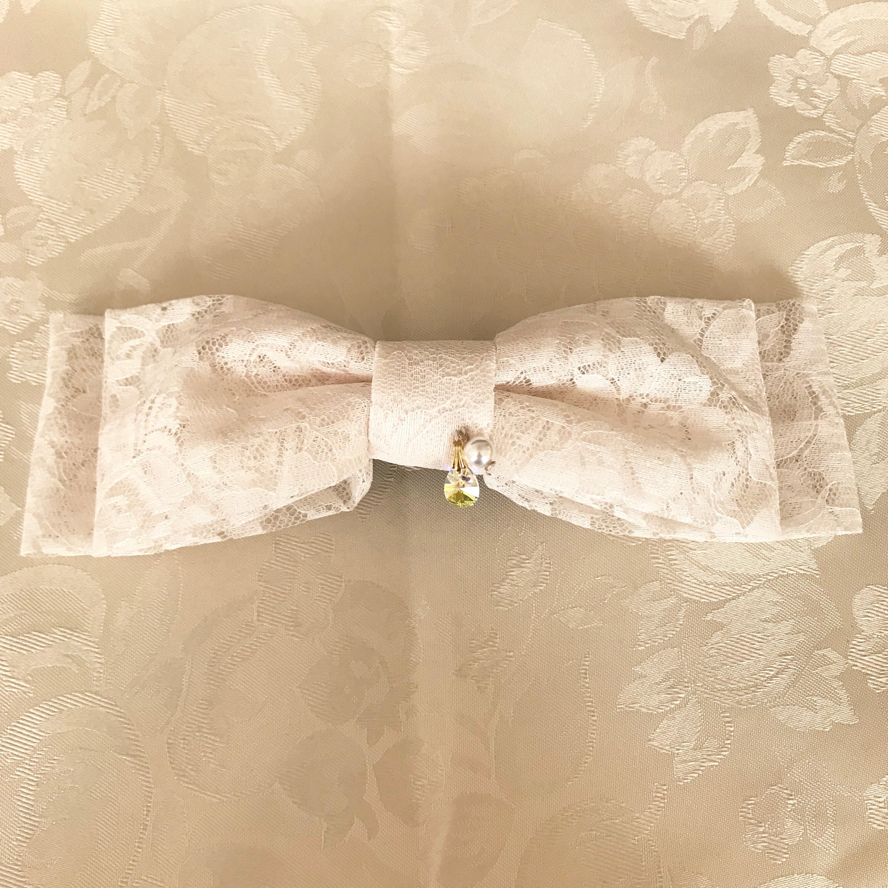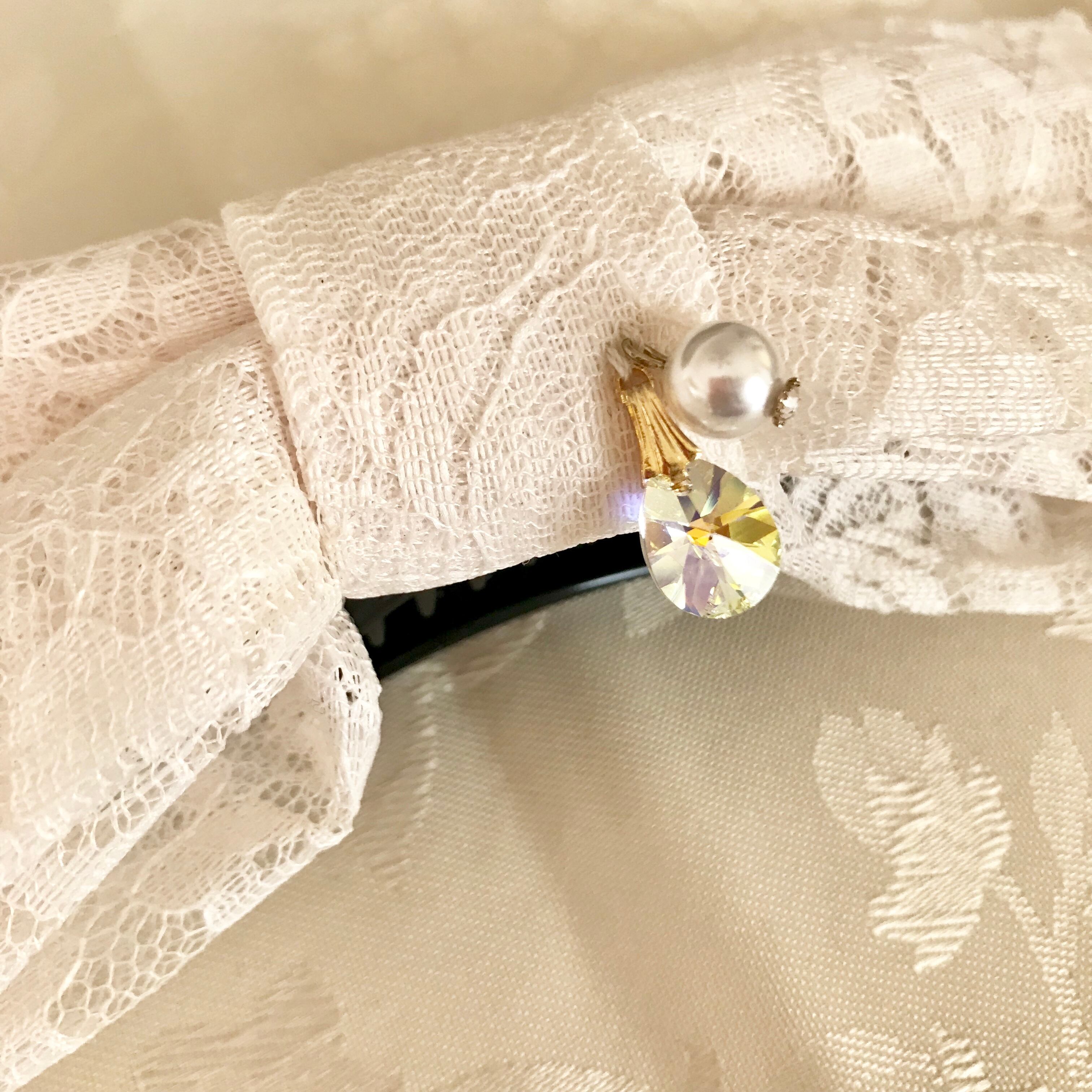 おりぼんにした際にレース柄が上品に出るものを沢山のレースから選びました❤︎上品なレース生地のおりぼんにキラキラ輝くスワロフスキーと艶パールをゆらゆらさせました(o^^o)女性の好きなもの全部詰め込んで上品可愛いものが出来上がりました❤︎