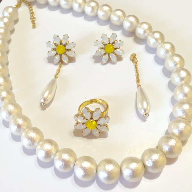 マーガレットをモチーフにしたピアスです。スワロフスキーを贅沢に使用してエレガントな作品です。