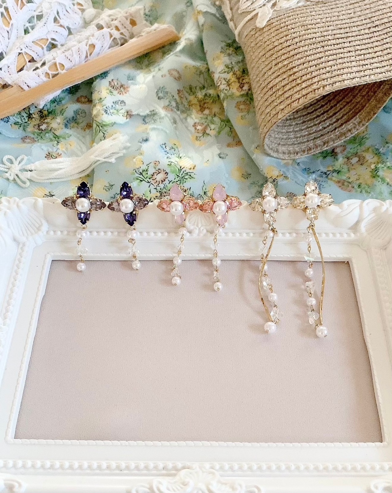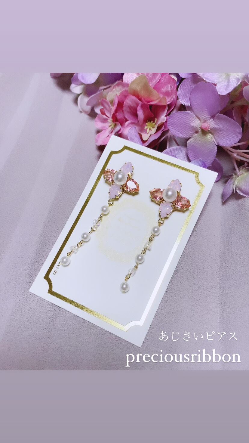大好きな紫陽花の花びらからインスピレーションを貰い身に付ける事で女性を美しく魅せてくれるピアスをつくりました。きらめくスワロフスキーと艶パールがとても目を惹きますよ♡