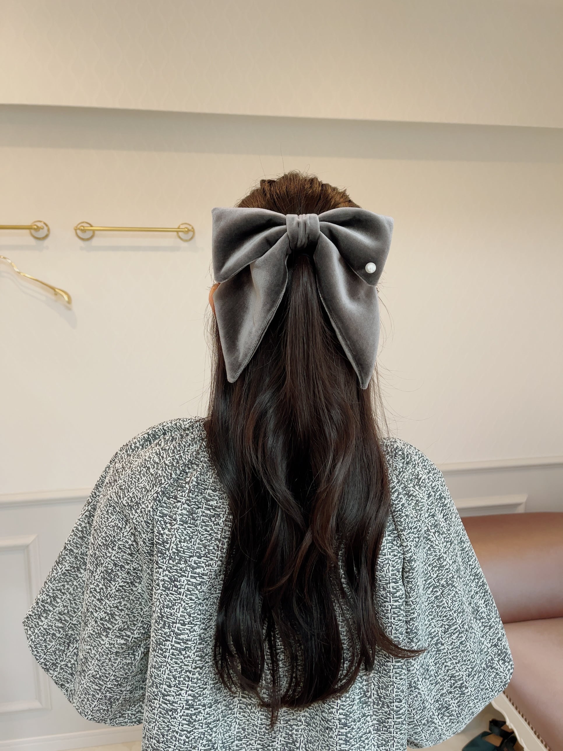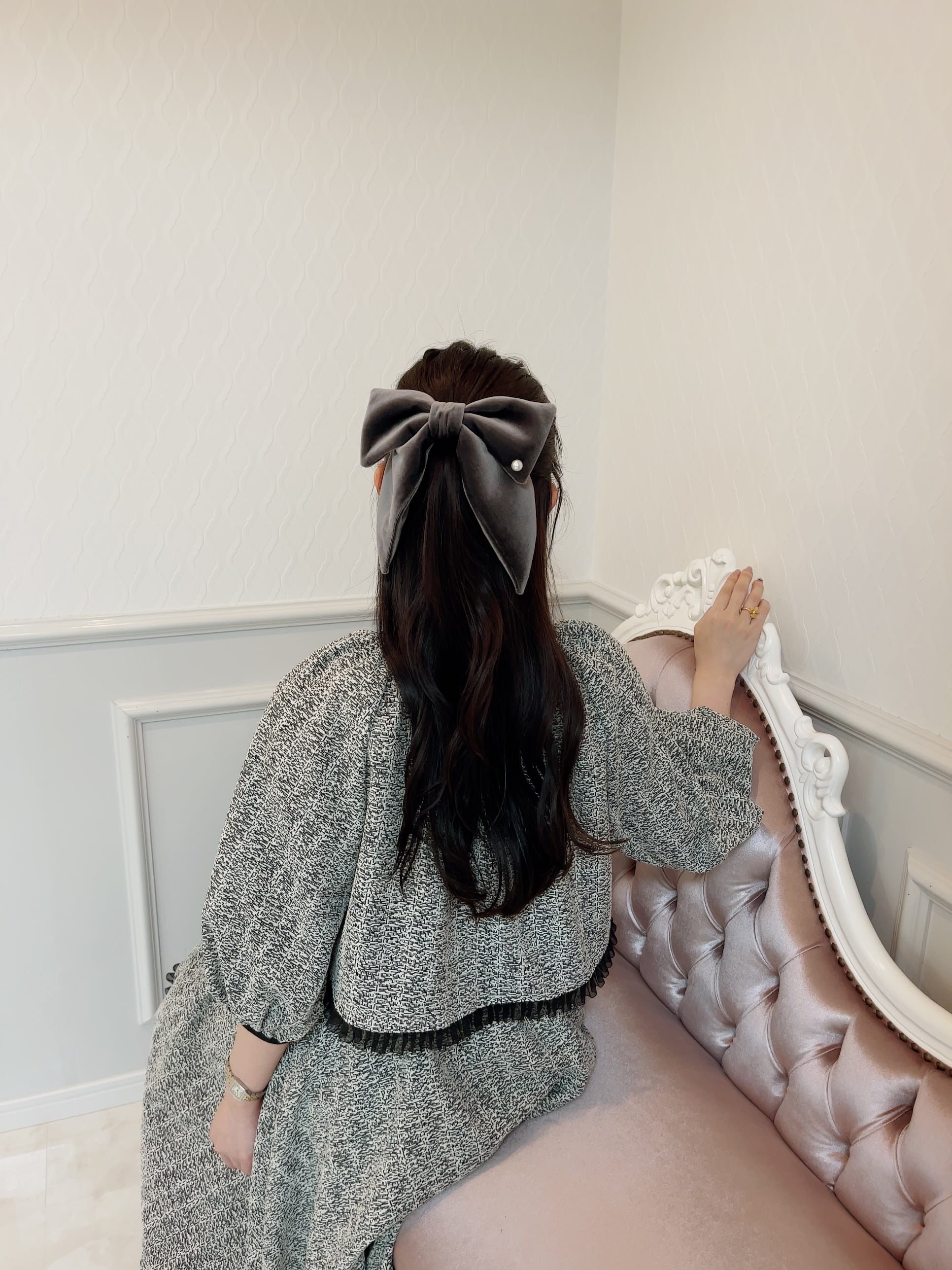 りぼんのカタチ、長さ、髪に付けた時の存在感を確認しながら何度も修正をして、やっと全てにおいてベストなベロアリボンバレッタが完成致しました❤︎